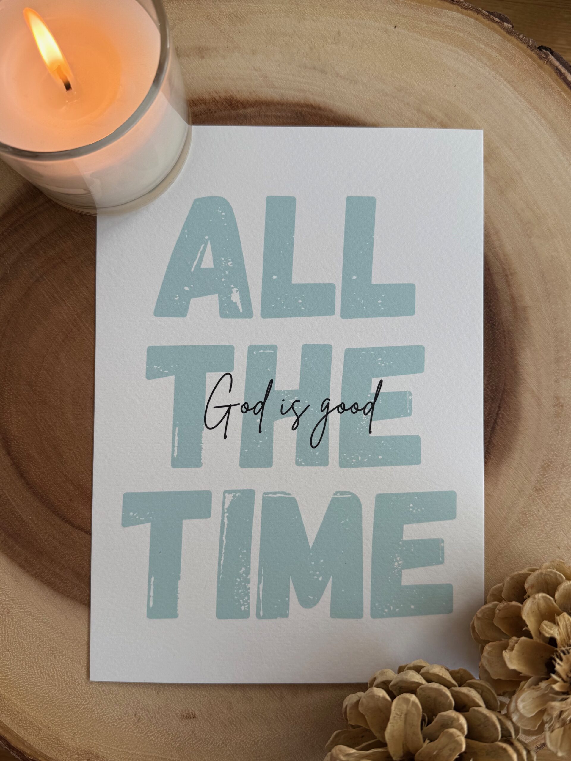 A simple and uplifting A5 print featuring the timeless phrase “God is good all the time.” Designed to inspire faith and gratitude, this piece serves as a daily reminder of God’s constant goodness and presence, bringing warmth and encouragement to any space.